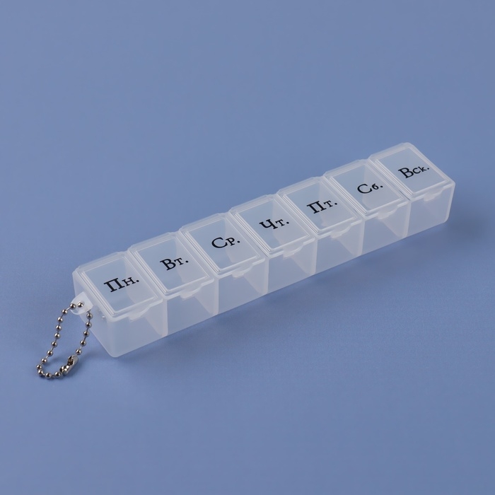Таблетница «На неделю», с цепочкой, русские буквы, 15 × 3,3 × 2 см, 7 секций, цвет МИКС