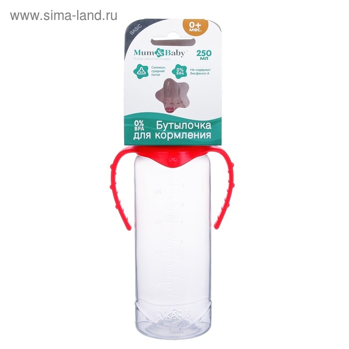 Бутылочка для кормления, классическое горло, с ручками, 250 мл., от 3 мес., цвет красный