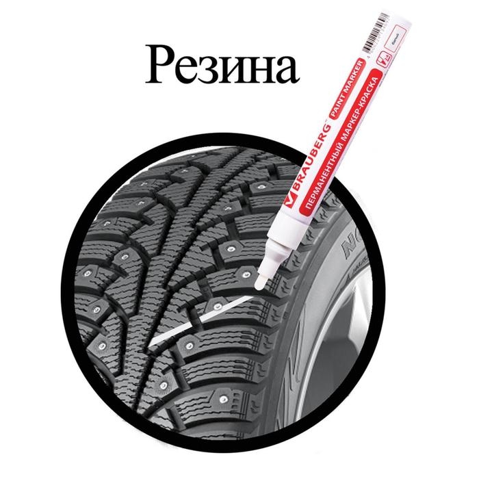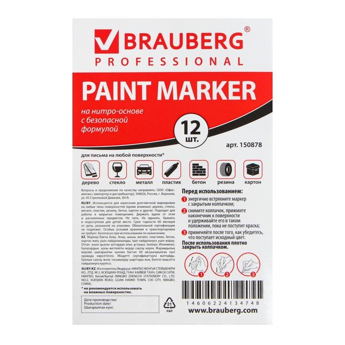 Маркер-краска лаковый BRAUBERG предназначен для маркировки различных материалов в промышленных условиях: бетона, дерева, стекла, металла, резины, пластика. Также подходит для творчества и декорирования. СПОСОБ ПРИМЕНЕНИЯ:1. Перед использованием хорошо встряхнуть с закрытым колпачком.2. Снять колпачок, надавить на наконечник, дождаться, когда краска полностью пропитает его.3. После использования плотно закрыть колпачок.Чернила с лаковым эффектом производства компании MULTICHEM не содержат ксилол, являясь экологичными и безопасными для окружающей среды. Не имеют резкого запаха нитро-краски в отличие от большинства аналогов, что позволяет использовать данный маркер в закрытых помещениях без вреда для здоровья. Отличаются термо- и водостойкостью, устойчивы к выцветанию. Пишет по сухим, жирным, грязным, ржавым поверхностям. Заправлен высококачественными чернилами с лаковым эффектом. Ширина линии письма составляет 2-4 мм. Прочный круглый наконечник выполнен из пористого акрила. Имеет алюминиевый корпус.