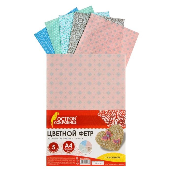 Фетр А4, 5 листов, 5 цветов, BRAUBERG "Пастельные цвета", с рисунком