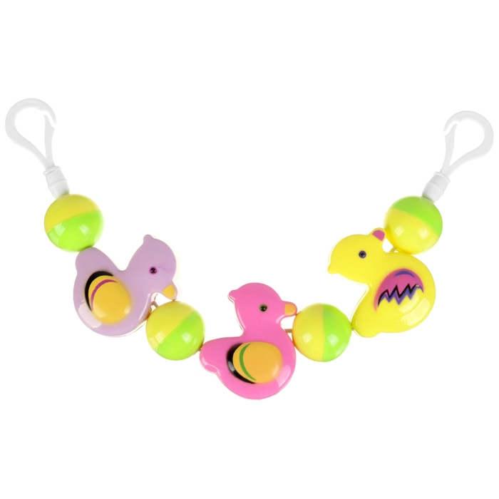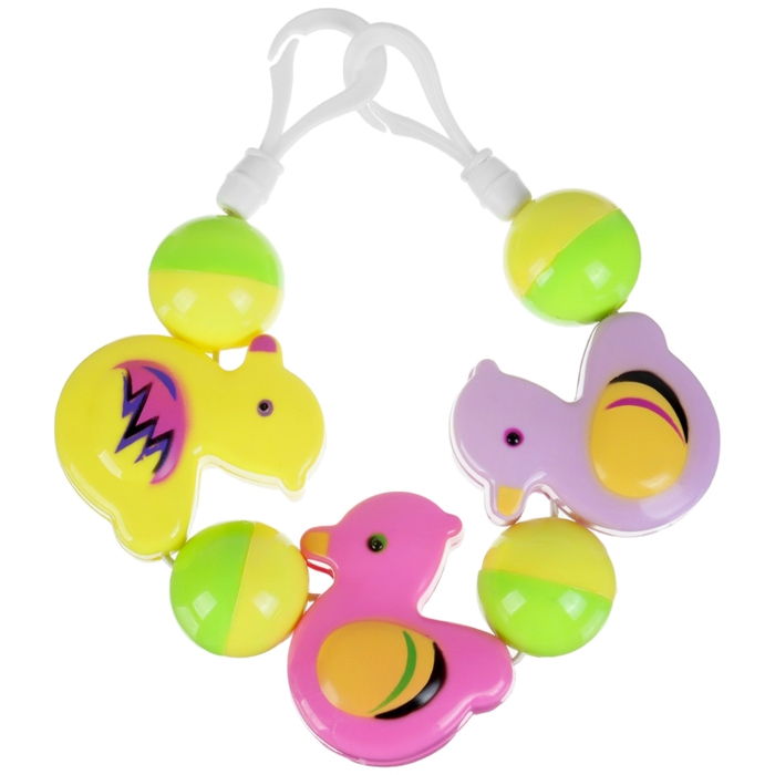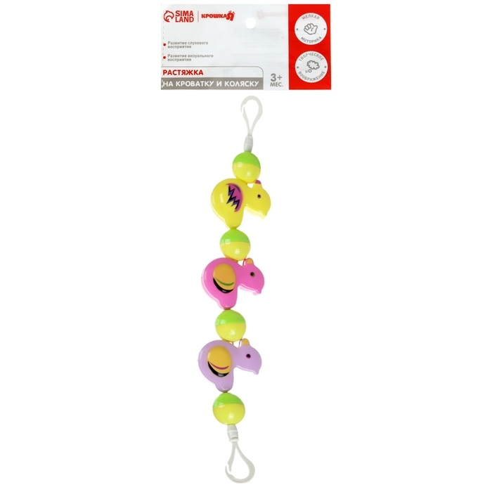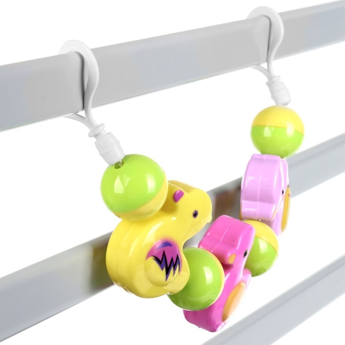 Яркая погремушка-растяжка оснащена удобными креплениями, которые подойдут практически для любого типа коляски, кроватки и даже автокресла.