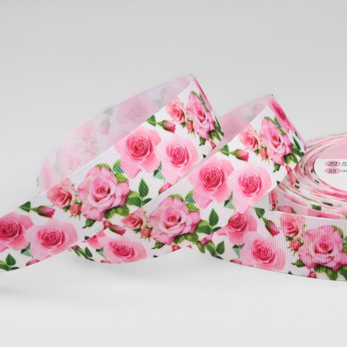 Лента репсовая «Розы», 25 мм, 18 ± 1 м, цвет белый/розовый