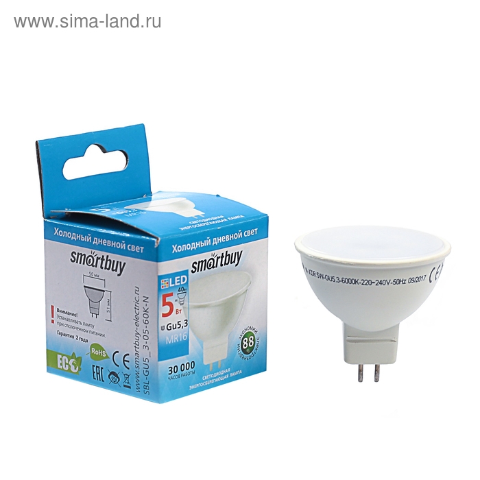 Лампа cветодиодная Smartbuy, GU5.3, 5 Вт, 6000 К, холодный белый свет