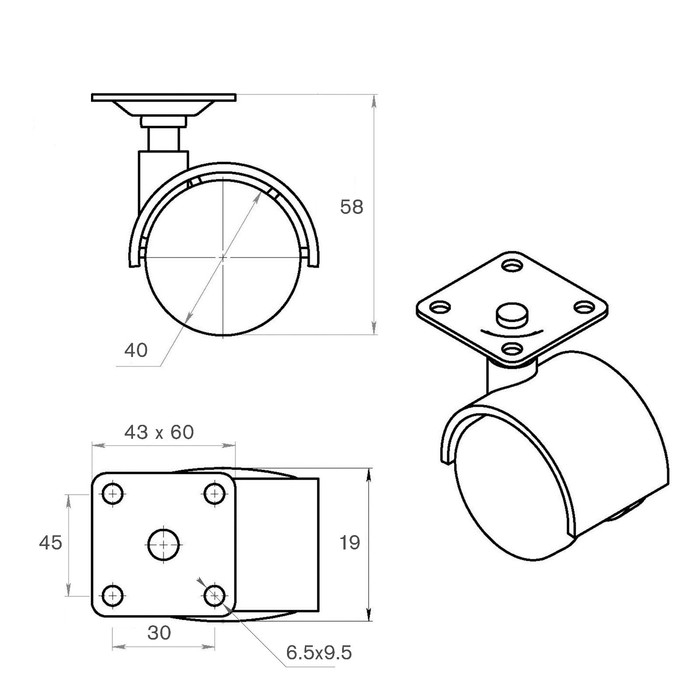 Колесо мебельное, d=40 мм, без тормоза, черное