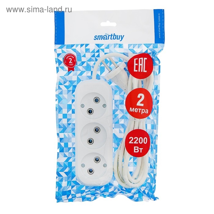 Удлинитель Smartbuy, 3 розетки, 2 м, 10 А, 2200 Вт, ПВС 2х1 мм2, без з/к, белый