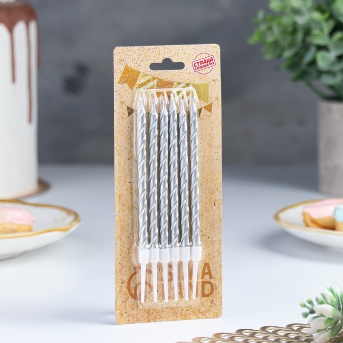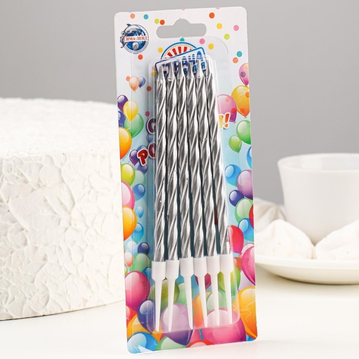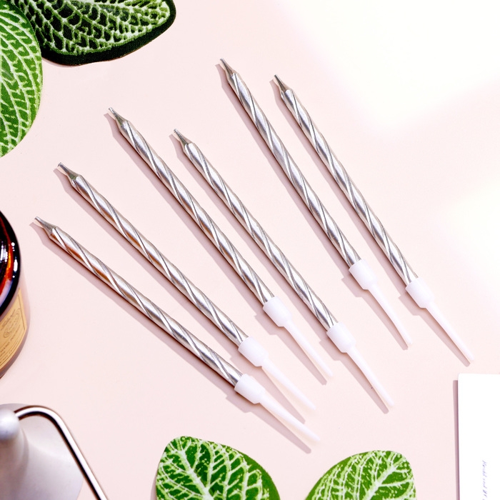 Свечи в торт "Металлик" , 14см, 6шт с подставкой, серебристые