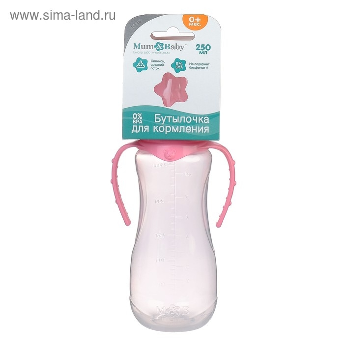 Бутылочка для кормления, классическое горло, приталенная, с ручками, 250 мл., от 3 мес., цвет розовый МИКС