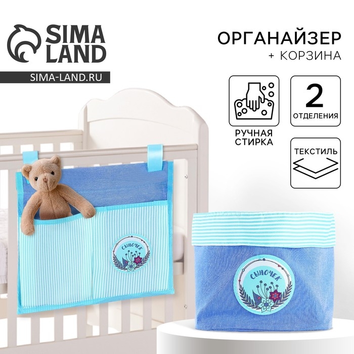 Органайзер для хранения вещей на детскую кроватку 2 отделенияи настольная корзинка «Лучший в мире малыш»
