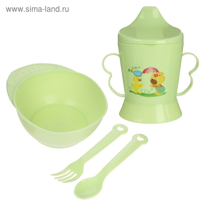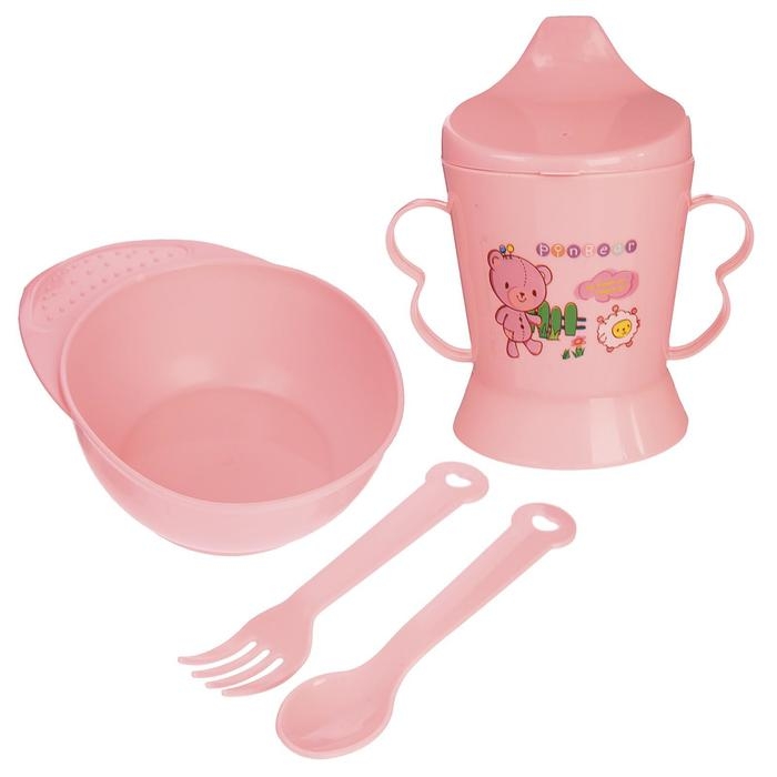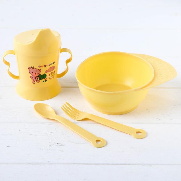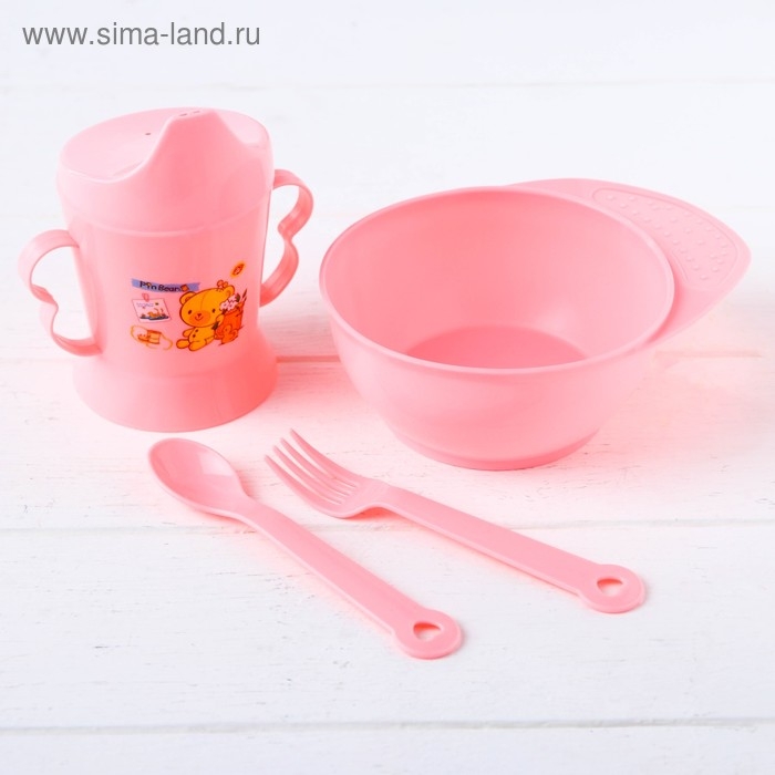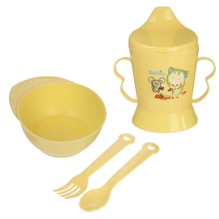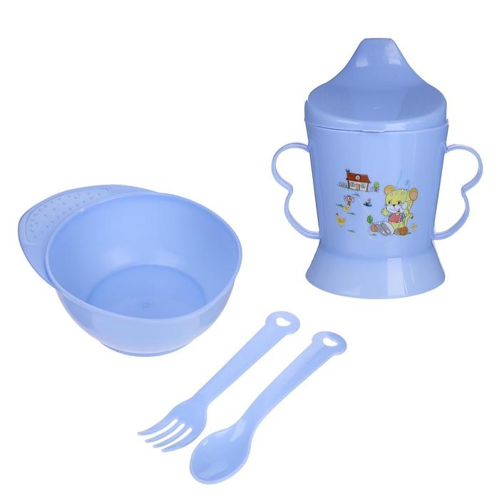 Набор детской посуды, 4 предмета: миска, ложка, вилка, поильник с твёрдым носиком 200 мл, цвета МИКС