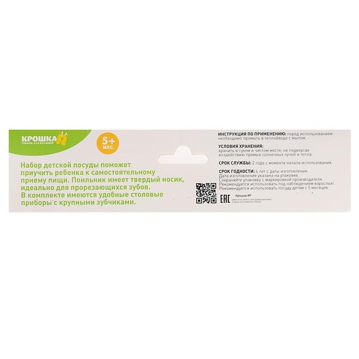 Комплект подходит для малышей, которые учатся кушать самостоятельно. Пластиковая посуда не бьётся и имеет небольшой вес. Её яркий дизайн непременно понравится крохе.