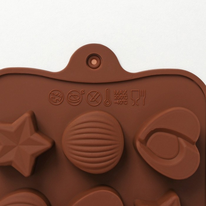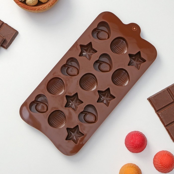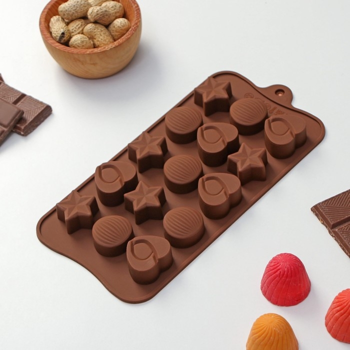 Форма для конфет и шоколада Доляна «Звёзды, ракушки, сердца», силикон, 20,6×10,3 см, 15 ячеек, цвет коричневый