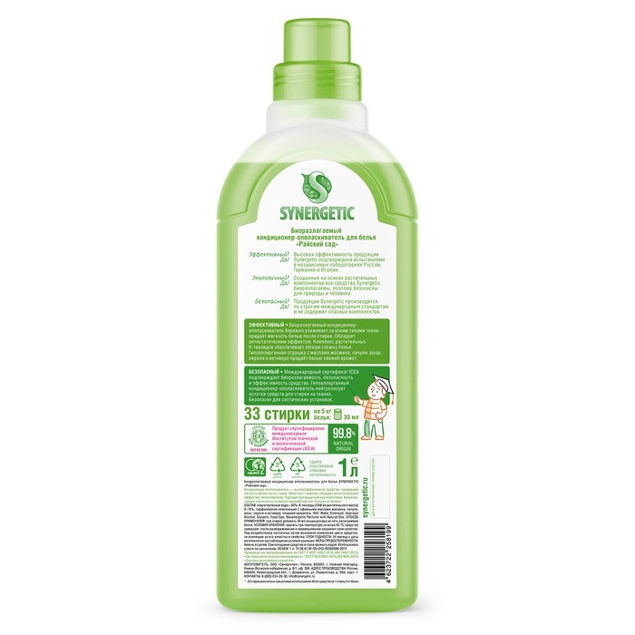 Биоразлагаемый кондиционер-ополаскиватель для белья SYNERGETIC "Райский сад" – высокоэффективное средство, бережно ухаживающее за всеми типами ткани, в том числе деликатными, и придающее особую мягкость и нежность белью после стирки.