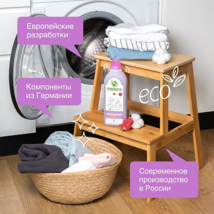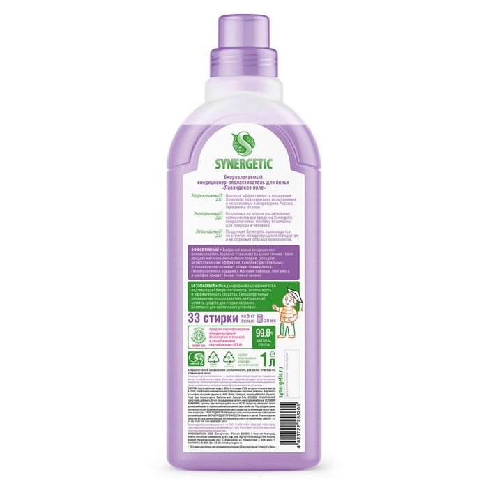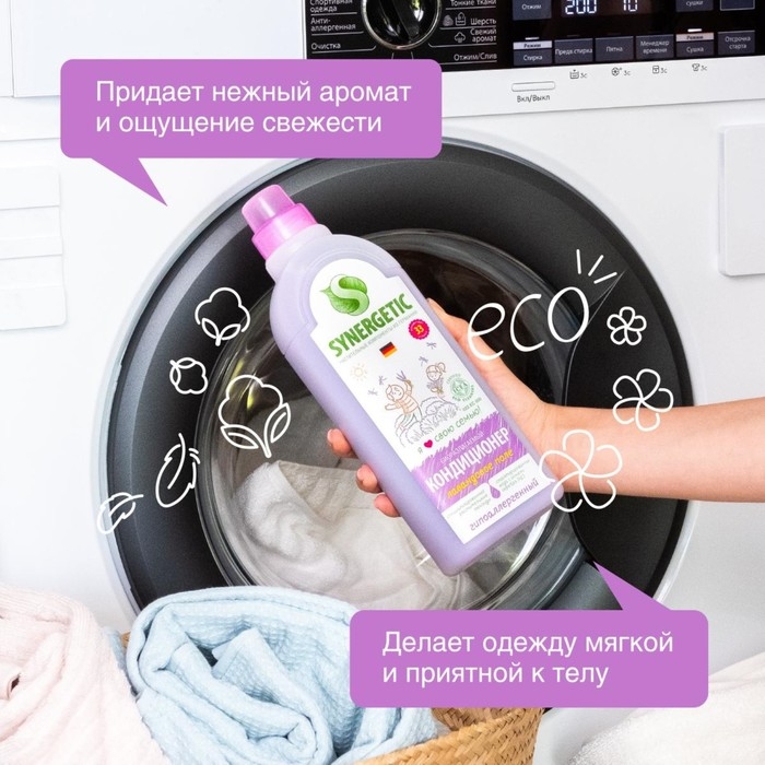 Биоразлагаемый кондиционер-ополаскиватель для белья SYNERGETIC "Лавандовое поле" – высокоэффективное средство, бережно ухаживающее за всеми типами ткани, в том числе деликатными, и придающее особую мягкость и нежность белью после стирки.