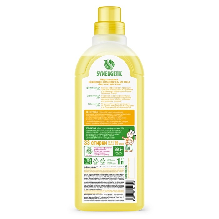 Биоразлагаемый кондиционер-ополаскиватель для белья SYNERGETIC "Цветочная фантазия"– высокоэффективное средство, бережно ухаживающее за всеми типами ткани, в том числе деликатными, и придающее особую мягкость и нежность белью после стирки.