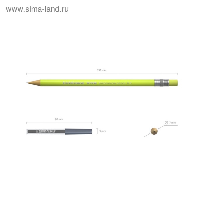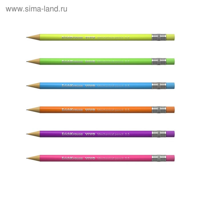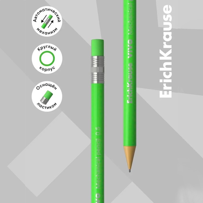 Круглый механический карандаш. Корпус и кнопка-ластик в ярких неоновых цветах. Твердость HB. Диаметр грифеля 0.5 мм.