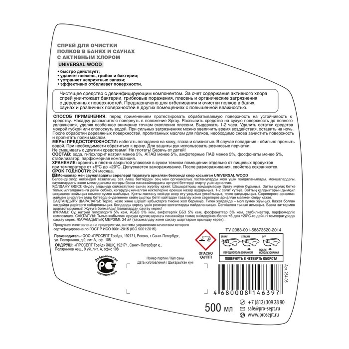 Спрей для очистки и отбеливания полков, скамеек и других деревянных поверхностей в помещениях с повышенной влажностью – банях, саунах.