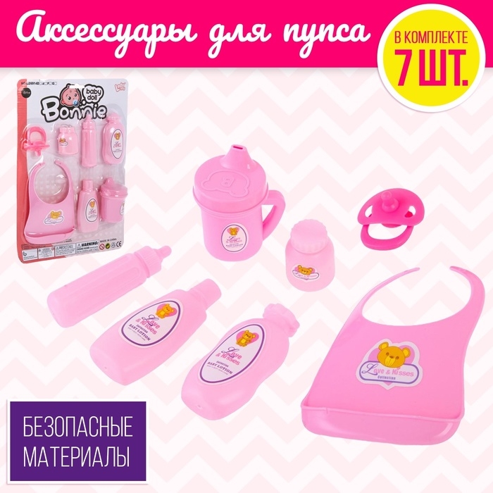 - 2 бутылочки и 1 баночка средств для ухода за пупсом (имитация);