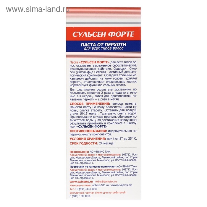 Паста «Сульсен форте» для всех типов волос оказывает выраженное себостатическое, отшелушивающее действие. Содержит Сульсен (Дисульфид Селена) - активный дерматологический компонент. Обладает тройным механизмом действия на кожу головы: удаляет перхоть, отшелушивает омертвевшие клетки, нормализует функцию сальных желез. Для достижения результата достаточно использовать средство 2 раза в неделю в течение 3-4 недель, затем для профилактики появления перхоти – 2 раза в месяц.