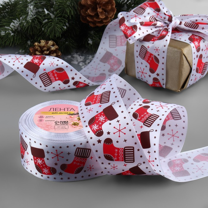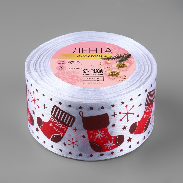 Лента атласная «Валенки», 50 мм, 23 ± 1 м, цвет белый/красный