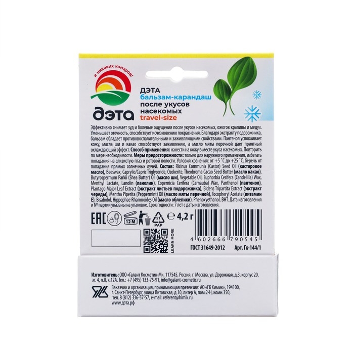 Активное вещество:Пропиленгликоль > 30%, вода >30%, стеарат натрия >5%, но < 15%, экстракт ромашки < 5%, экстракт Алоэ Вера < 5%, глицерин < 5%, метилпарабен < 5%, пропилпарабаен < 5%, ментил лактат < 5%, аллантоин <5%.Описание:Эффективно снимает зуд и болевые ощущения после укусов насекомых, ожогов крапивы и медуз. Уменьшает отечность, способствует исчезновению покраснения. Благодаря экстракту подорожника, бальзам обладает противовоспалительными и заживляющими свойствами. Аллантоин успокаивает кожу, а ментол дает приятный охлаждающий эффект.• Эффективно снимает зуд и болевые ощущения после укусов насекомых;• Уменьшает отечность, способствует исчезновению покраснения;• Экстракт ромашки и алоэ вера заживляют и снимают воспаление;• Аллантоин успокаивает кожу;• Ментил лактат даёт приятный охлаждающий эффект;• Хорошо увлажняет и питает кожу.Форма выпуска:Стик 10 мл.Условия храненияОт 0°C до +40°C.Способ применения Равномерно нанесите бальзам на место укуса. При необходимости повторите обработку.Используйте только по назначению! Предохраняйте от воздействия прямых солнечных лучей и нагревания выше +40°С.