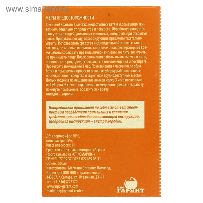 Действующие вещества: хлорпирифос (50 %), циперметрин (5 %).