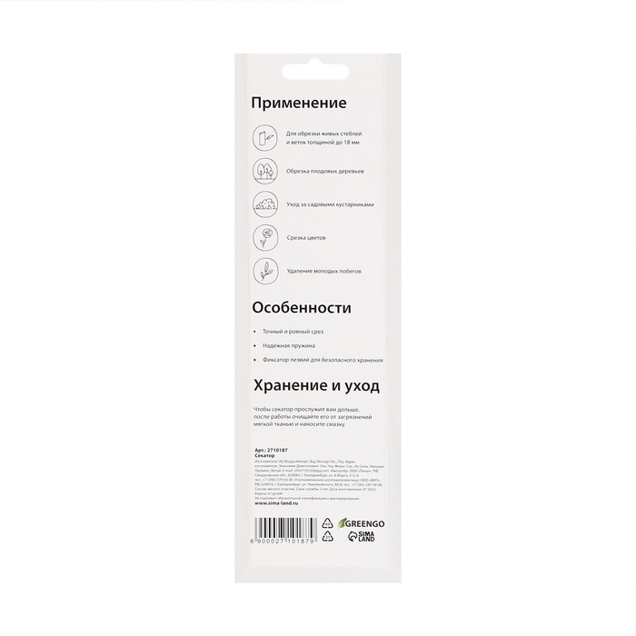 Секатор Greengo предназначен для прореживания нетолстых веток и формирования кроны деревьев и кустарников. Также используется при сборе винограда или при удалении усиков у клубники.