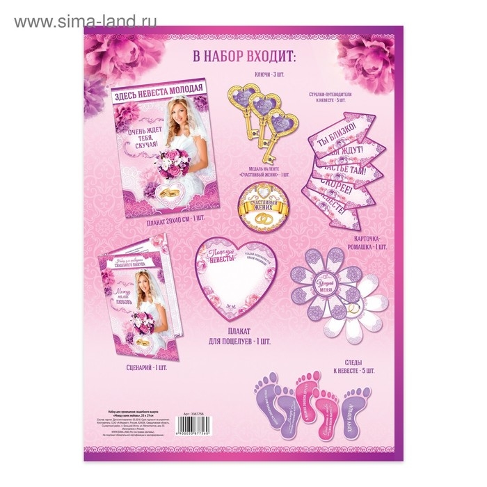 Выкуп невесты считается традиционным свадебным ритуалом, который задаёт веселое настроение предстоящему праздничному дню. Смысл свадебного выкупа заключается в том, что жених со своими друзьями должен вызволить невесту из дома её родителей, предварительно пройдя все испытания и расплатившись за свою будущую жену деньгами, конфетами или любой другой валютой. Помощником в проведении может стать наш набор для выкупа, который сделает ваше мероприятия ярким, интересным и красочным! В набор для проведения свадебного выкупа входят: сценарий, плакат, несколько занимательных игр и испытаний для жениха, указательные стрелки.
