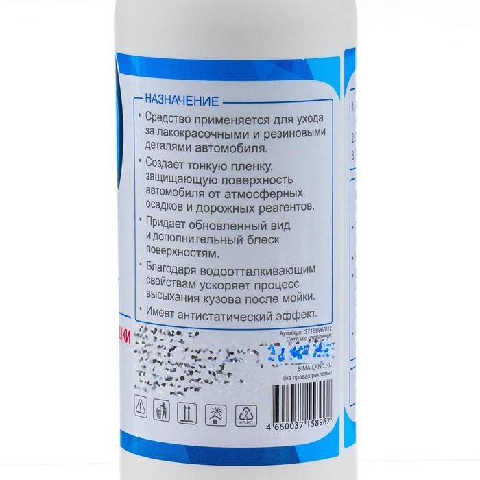 - Создает тонкую пленку, защищающую поверхность автомобиля от атмосферных осадков и дорожных реагентов.