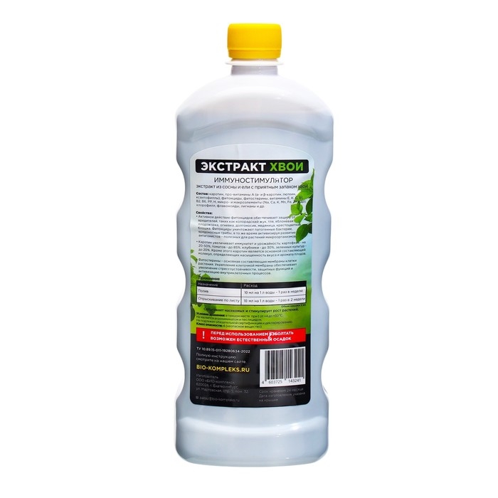 Экстракт хвойных деревьев с богатым составом биологически активных веществ. Отпугивает вредителей, защищает от болезней. Улучшает иммунитет, обмен веществ, стрессоучивость, урожайность.