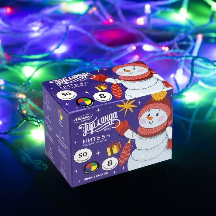 Гирлянда «Нить» 5 м, IP20, белая нить, 50 LED, свечение мульти, 8 режимов, 220 В