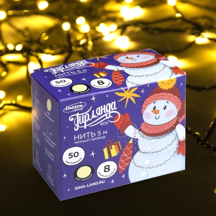 Гирлянда «Нить» 5 м, IP20, тёмная нить, 50 LED, свечение тёплое белое, 8 режимов, 220 В