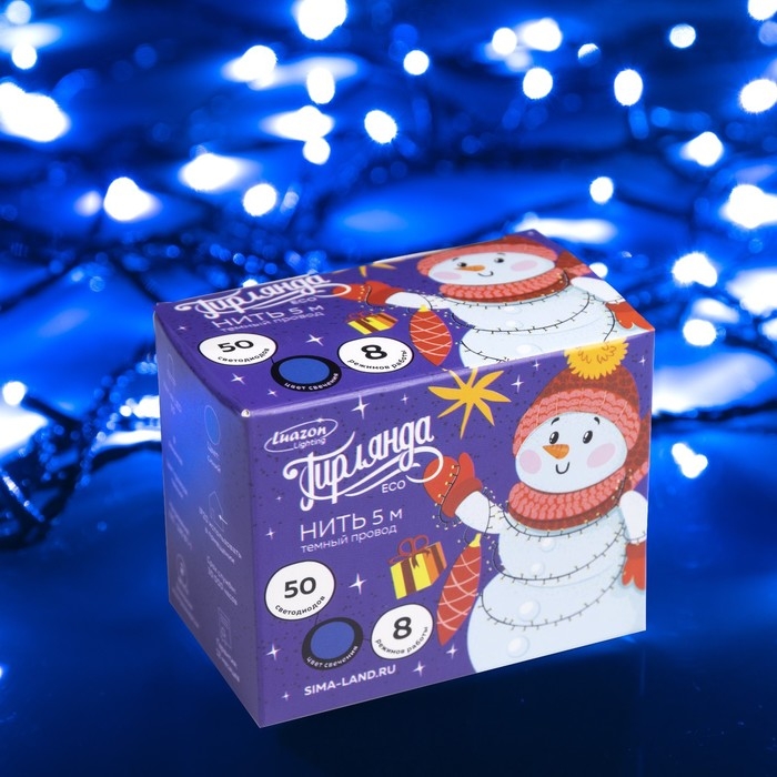 Гирлянда «Нить» 5 м, IP20, тёмная нить, 50 LED, свечение синее, 8 режимов, 220 В