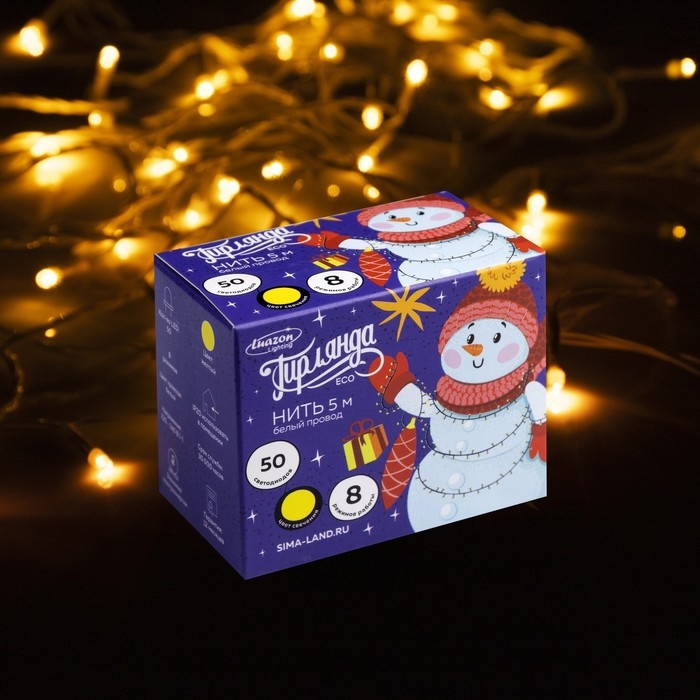 Гирлянда «Нить» 5 м, IP20, белая нить, 50 LED, свечение жёлтое, 8 режимов, 220 В