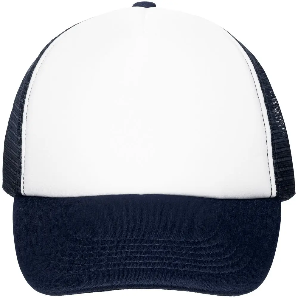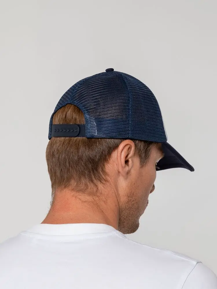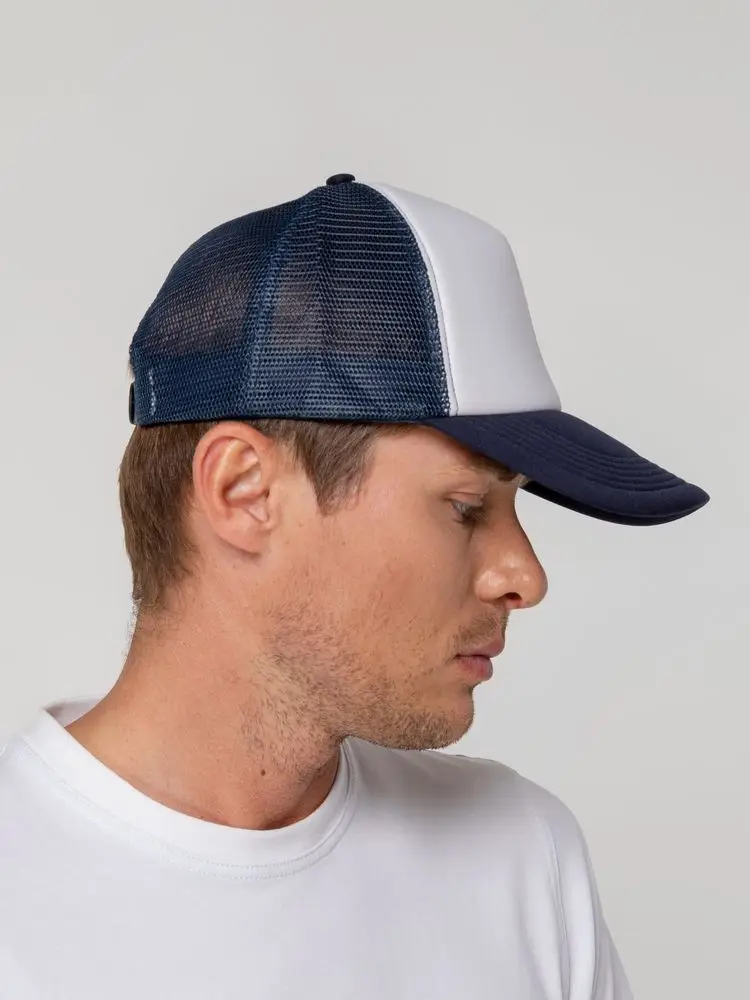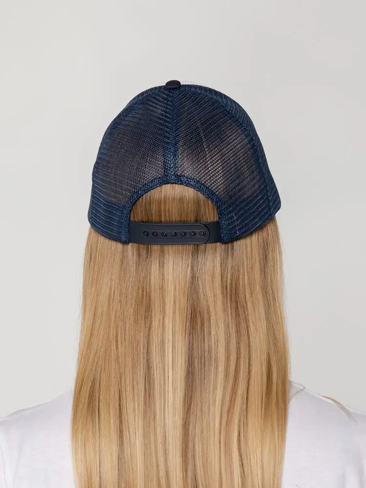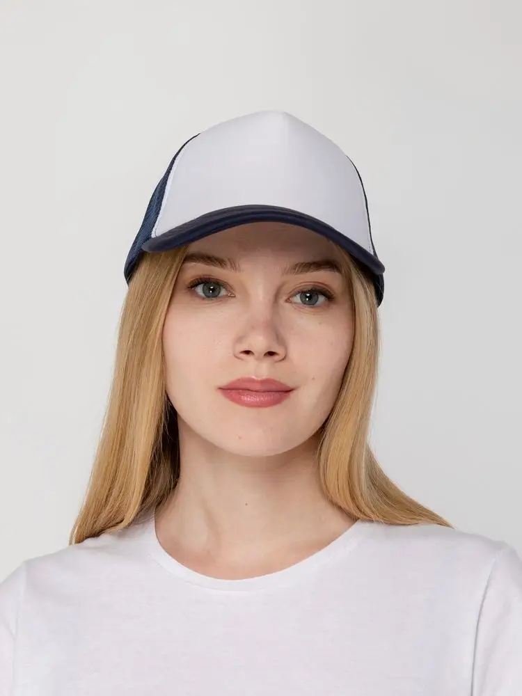 Стандартная модель с 5 клиньями без лобового шва в нестандартном исполнении. Передний клин и козырек выполнены из полиэстера с наполнителем из поролона, боковые и задние клинья — из сетки. Размер регулируется с помощью пластиковой застежки.