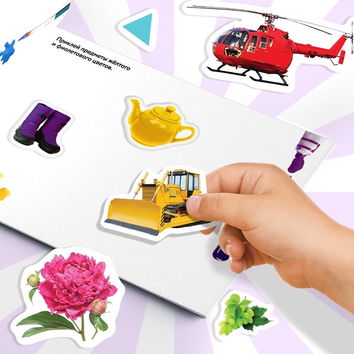 На каждой странице есть задания, в которых необходимо приклеить картинки с соответствующими персонажами и предметами или их определённое количество. Упражнения положительно влияют на развитие мелкой моторики, внимания, речи и расширение кругозора.