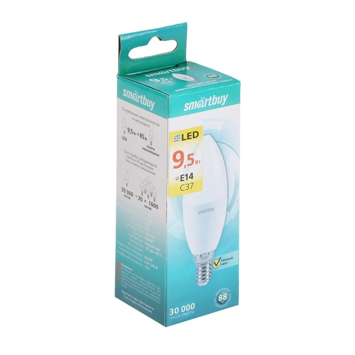 Лампа светодиодная Smartbuy, Е14, C37, 9.5 Вт, 3000 К, теплый белый свет