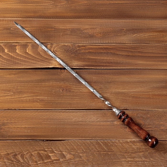 Шампур изготовлен из высококачественной нержавеющей стали, размер и толщина которой обеспечивает равномерную прожарку и сохранение сочности мяса. Резная деревянная рукоять не только придает шарм внешнему виду шампура, но и обеспечивает удобный захват и предотвращает ожоги.