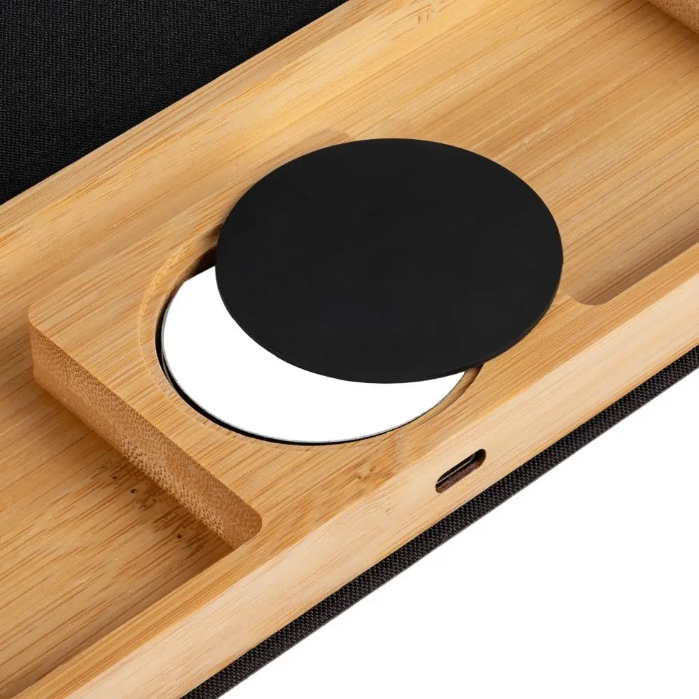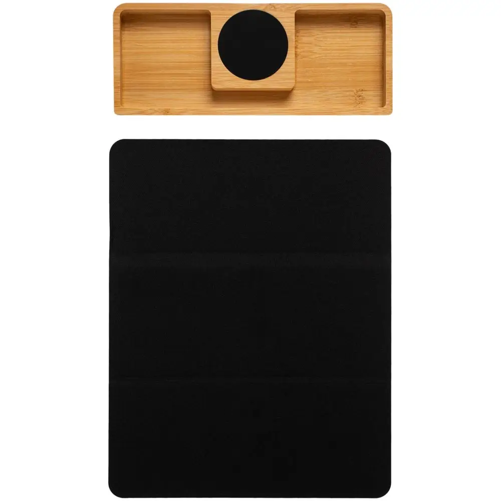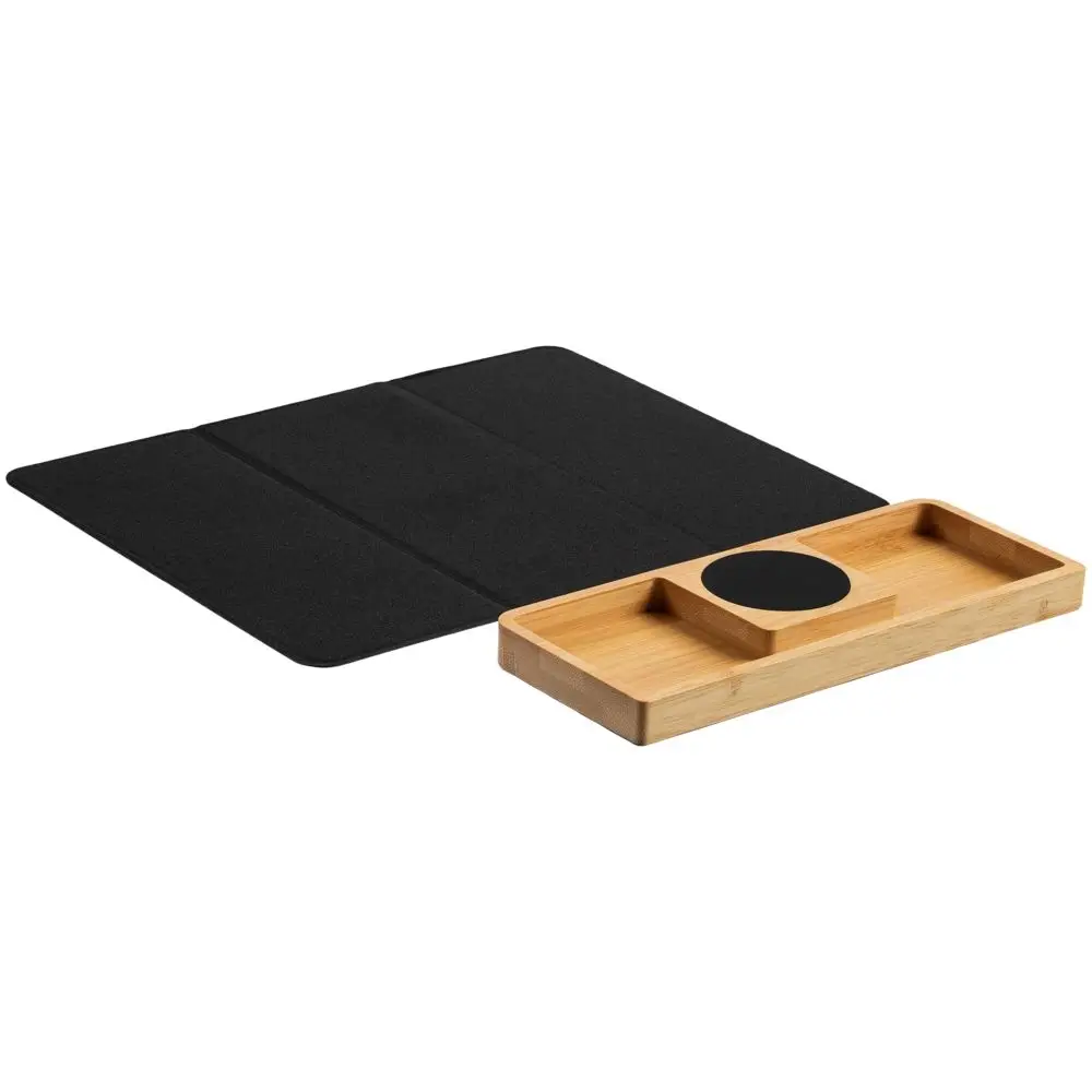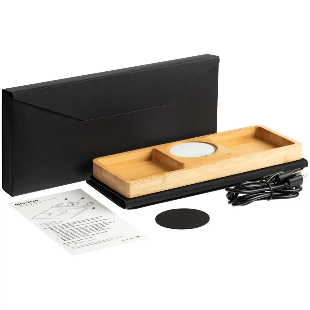 Настольный органайзер Midstream — это бамбуковая подставка для беспроводной зарядки телефона с емкостью для хранения мелких предметов и коврик для мыши. Зарядка и коврик с помощью магнитов образуют единое целое, но при необходимости могут использоваться и по отдельности. Коврик складывается: легко подобрать удобный размер.