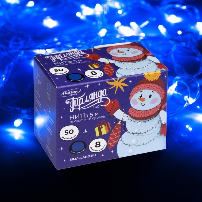 Гирлянда «Нить» 5 м, IP20, прозрачная нить, 50 LED, свечение синее, 8 режимов, 220 В