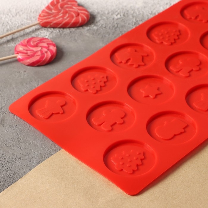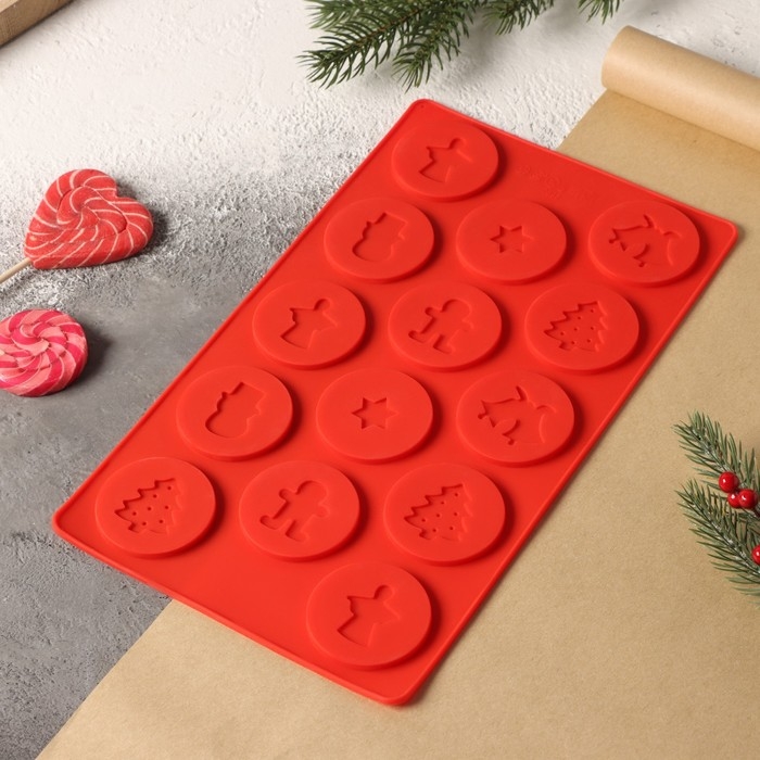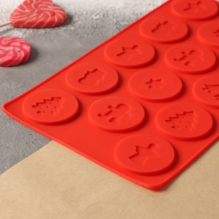 Форма для конфет и шоколада новогодняя Доляна «Новогодние кружочки», силикон, 29,8×17,5 см, 14 ячеек (d=5 см), цвет красный