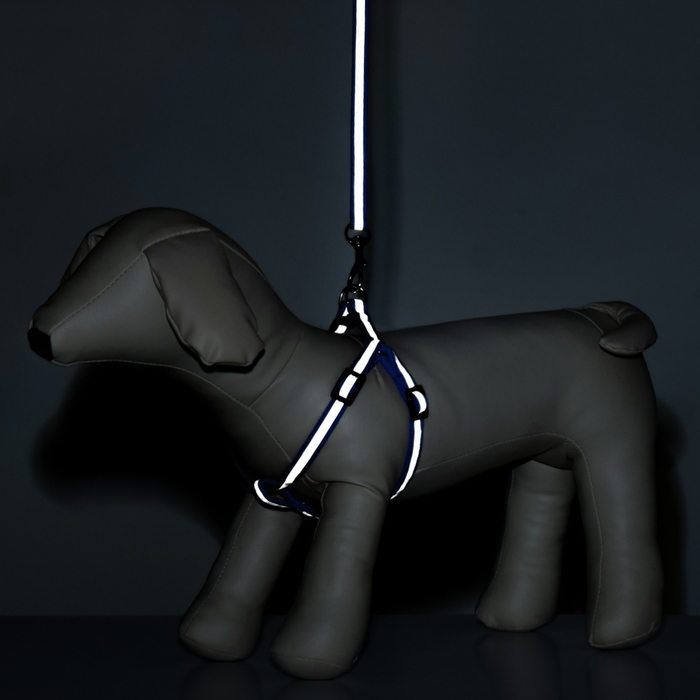 Комплект со светоотражающей лентой, ширина 1 см, поводок 120 см, шлейка 26-40 см, синий