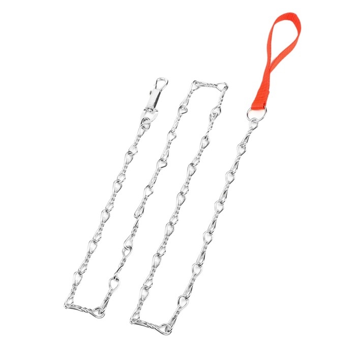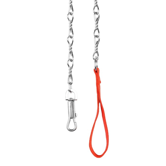 Поводок должен быть прочным и надежным. Металлический поводок полностью соответствует этим требованиям, плюс ко всему это красивый и износостойкий аксессуар. Поводок состоит из хромированной цепочки и мягкой нейлоновой ручки. Ручка прошита армированной нитью, удобно располагается в ладони и не натирает при натяжении. Поводок оснащен стальным карабином.