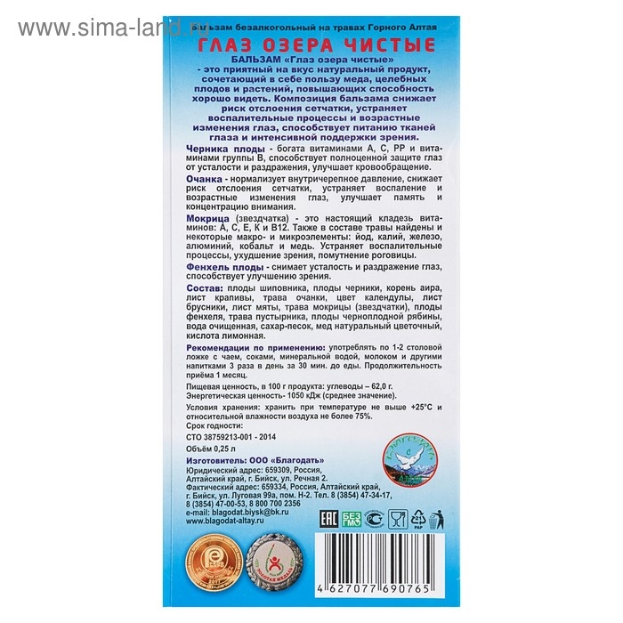 Бальзам безалкогольный "Глаз озера чистые" для зрения, 250 мл
