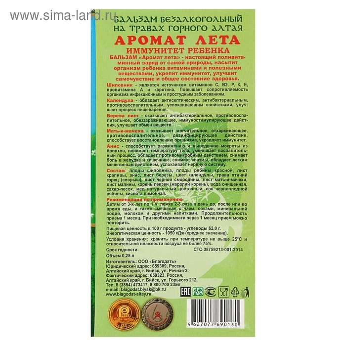 Бальзам «Аромат лета» — настоящий поливитаминный заряд от самой природы. Он насытит организм ребёнка витаминами и полезными веществами, укрепит иммунитет, улучшит самочувствие и общее состояние здоровья.