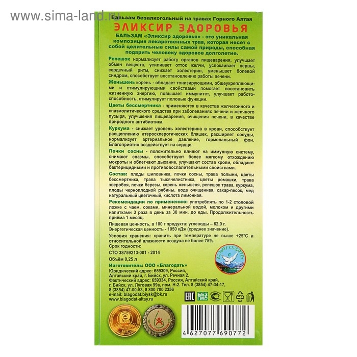 Бальзам безалкогольный «Эликсир здоровья», 250 мл