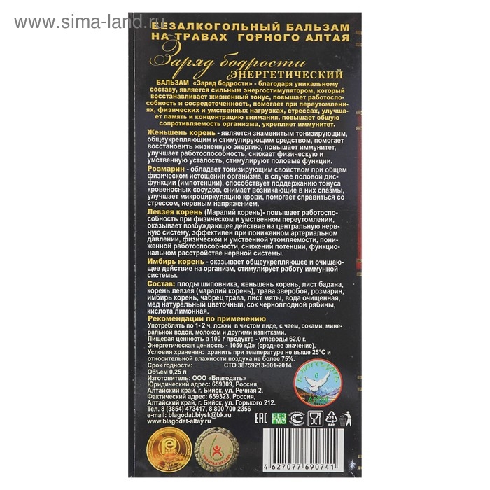Состав: плоды шиповника, женьшеня корень, лист бадана, корень левзеи (маралий корень), трава зверобоя, розмарин, имбиря корень, чабреца трава, лист мяты, вода очищенная, мёд натуральный цветочный, сок черноплодной рябины, кислота лимонная.
