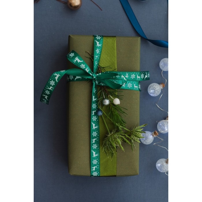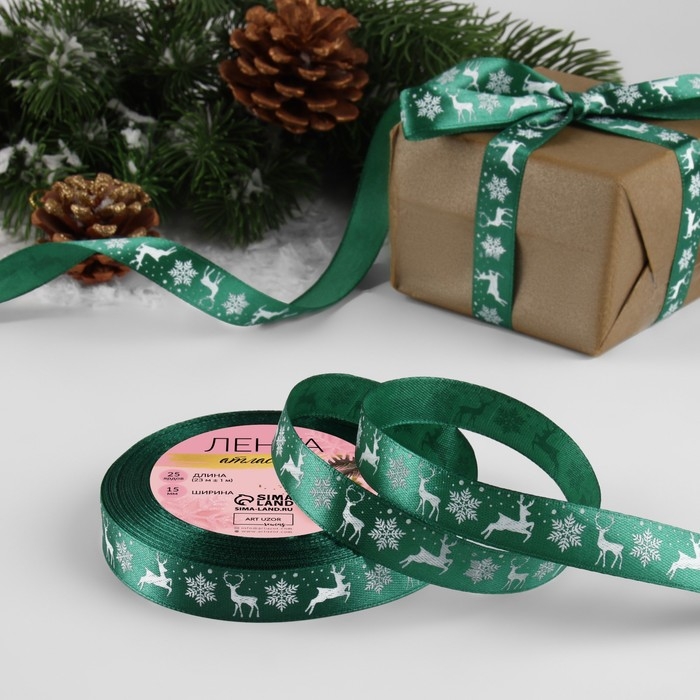 Новый год! Лента атласная «Олени», 15 мм, 23 ± 1 м, цвет зелёный №56