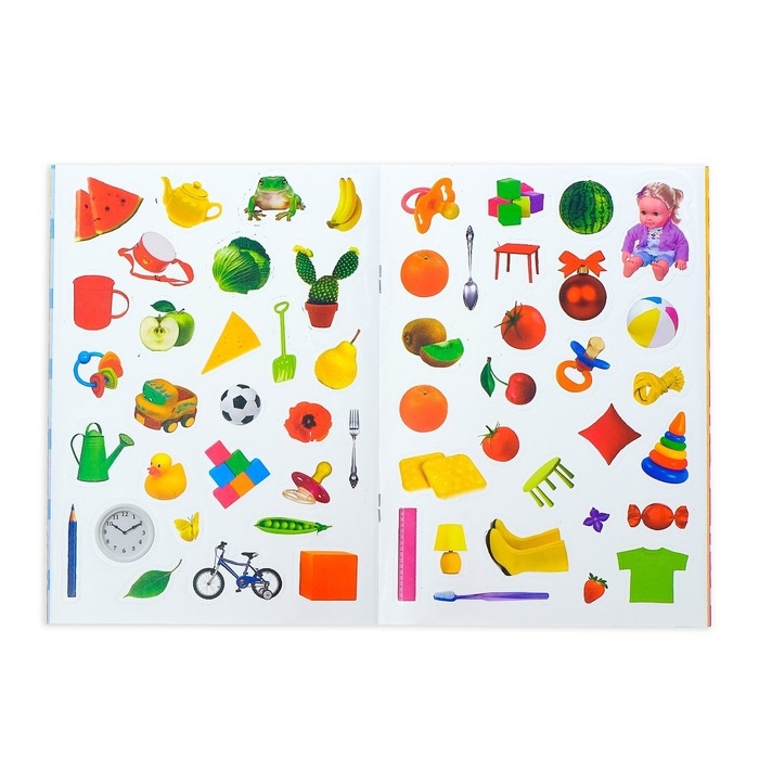 - В альбоме представлено более 100 наклеек с красочными изображениями животных, игрушек и не только.