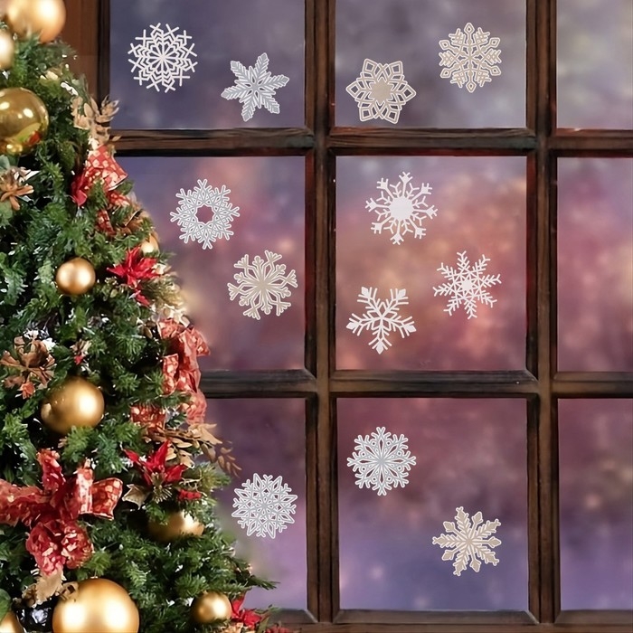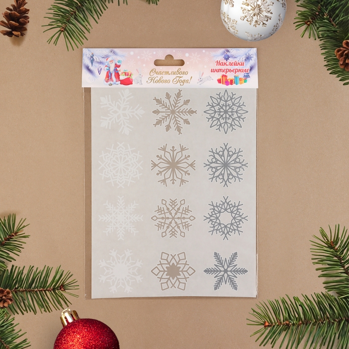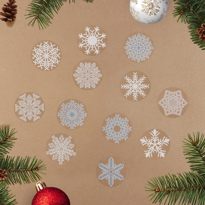 Набор наклеек новогодних "Снежинки" 12 шт в наборе, белые, золото, серебро, 9 x 9 см