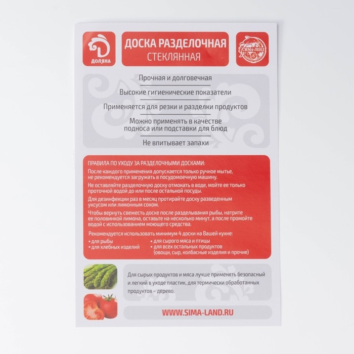 Стеклянная разделочная доска — это практичный аксессуар для нарезки продуктов, стильное украшение кухни и эффектная подставка для блюд. Стеклянная поверхность нейтрально относится к посторонним ароматам. Она не впитывает запахи и не поглощает влагу. Уход за изделием прост — достаточно промыть его под теплой водой и насухо вытереть салфеткой.